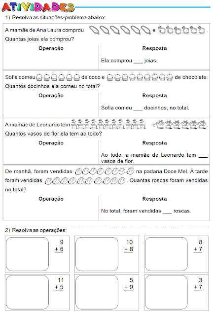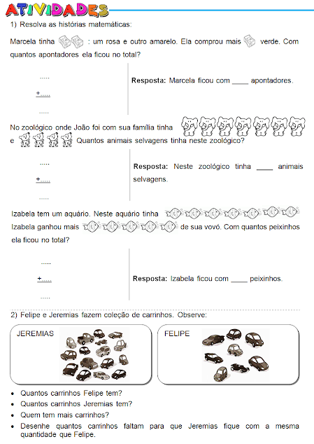 Ao trabalhar situações-problema com alunos de 1º Ano é fundamental a utilização de material concreto. Nas situações-problema, postadas abaixo, inicialmente, ao invés de números, usamos a quantidade expressa através de desenhos.